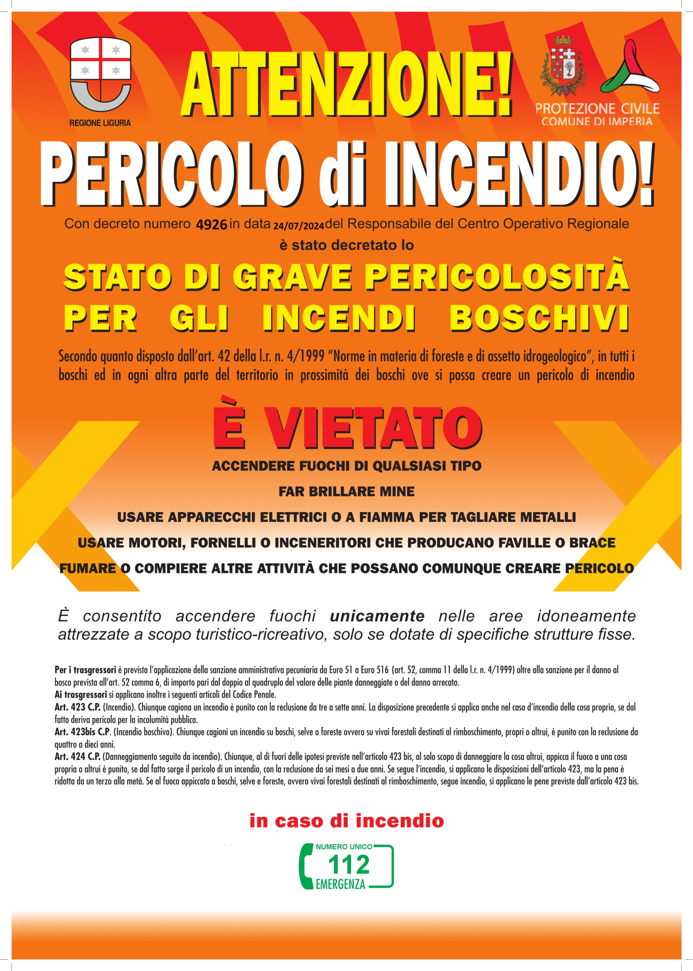 Si pubblica Decreto di Regione Liguria riguardante lo stato di grave pericolosità per gli incendi boschivi su tutto il territorio della Regione Liguria.
